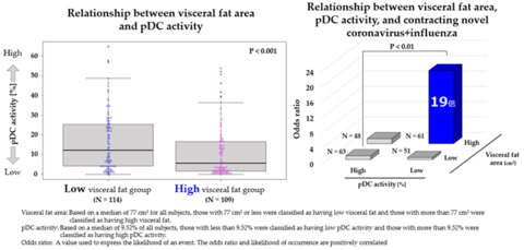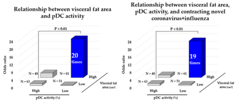 ขอแนะนำว่า การรักษามวลไขมันในอวัยวะภายในต่ำและการทำงานของ pDC สูงนั้น มีความสัมพันธ์กับการลดความเสี่ยงในการติดเชื้อโคโรนาไวรัสและไข้หวัดใหญ่