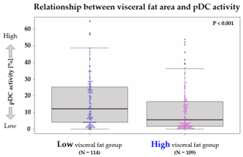 กลุ่มที่มีค่าบริเวณไขมันในอวัยวะภายในสูงจะมีการทำงานของ pDC ต่ำกว่ากลุ่มที่มีค่าบริเวณไขมันในอวัยวะภายในต่ำอย่างมีนัยสำคัญ (ภาพที่ 1)