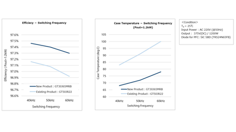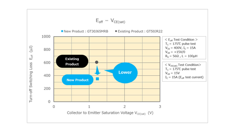 Toshiba นำกระบวนการล่าสุดมาสู่ IGBT ใหม่ โครงสร้างร่องลึกที่ปรับให้เหมาะสมช่วยรักษาระดับชั้นนำของอุตสาหกรรม[2] การสูญเสียที่เกิดจากการเปลี่ยนสถานะ (การสูญเสียที่เกิดจากการเปลี่ยนสถานะปิด) ที่ 0.35mJ (ทั่วไป)[3] ซึ่งต่ำกว่า GT50JR22 ในผลิตภัณฑ์ก่อนหน้าของ Toshiba ประมาณ 42%[4] IGBT ใหม่ยังมีไดโอดในตัวที่มีแรงดันไปข้างหน้า 1.20V (ทั่วไป)[5] ซึ่งต่ำกว่า GT50JR22 ประมาณ 43%[5] การปรับปรุงเหล่านี้ช่วยเพิ่มประสิทธิภาพของอุปกรณ์